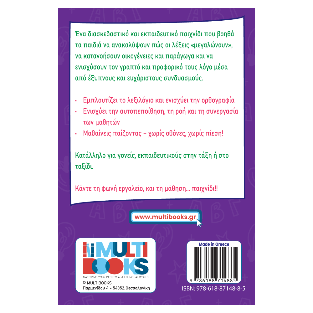 Η θεματική ενότητα Mini Flashcards - Παράγωγα (οικογένειες λέξεων) βοηθά τους παίκτες να ανακαλύψουν πώς οι λέξεις «μεγαλώνουν», να κατανοήσουν οικογένειες και παράγωγα και να ενισχύσουν τον γραπτό και προφορικό τους λόγο μέσα από έξυπνους και ευχάριστους συνδυασμούς.